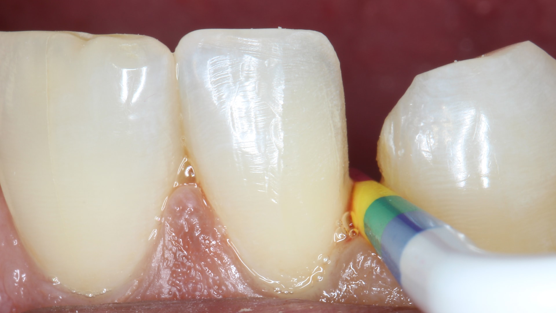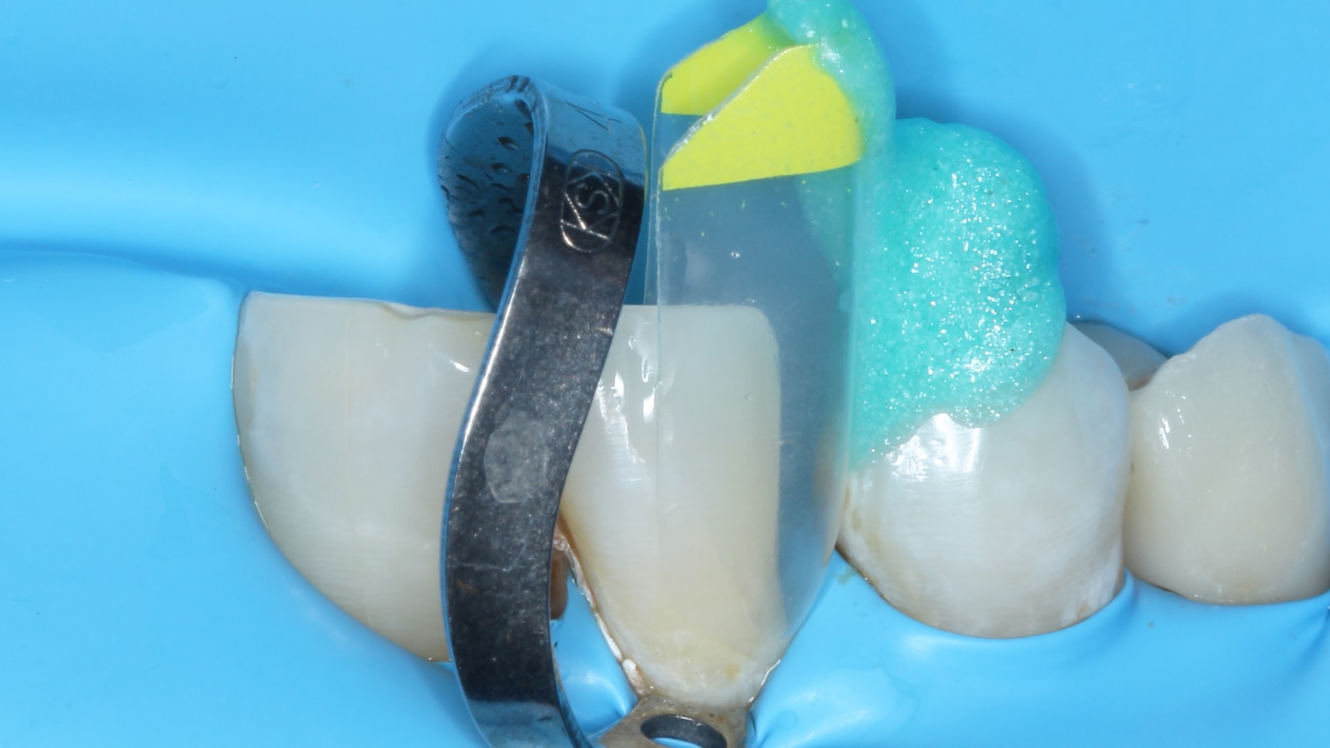 Rubber dam isolation was applied with an auxiliary anterior clamp on the lateral incisor. BioClear yellow matrix was placed and fixated using a little bit of gingival barrier.